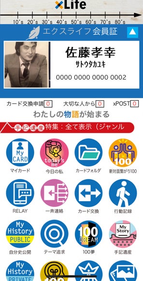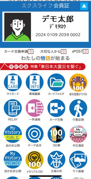 (2)デモ太郎のモデル会員証が表示されます。ここで再度赤字バーの手記遺産をタップしてください。デジタル手記遺産が表示されます(デモ太郎にある様々なアイコンを自由に試してxLifeが体験できます)。