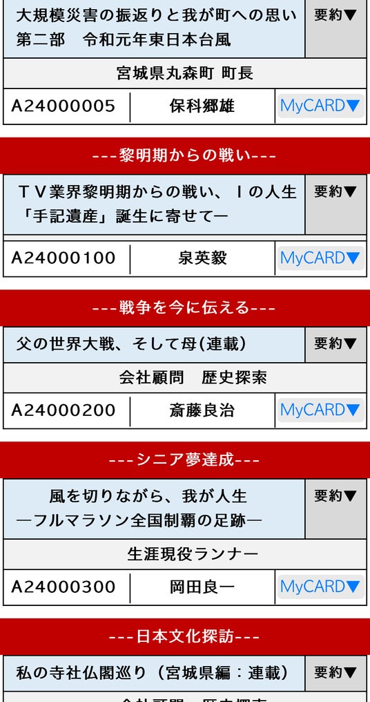 現在、手記遺産には人生回想録としての一般手記に加え、震災時に陣頭指揮をとられた市長、町長等が綴る「東日本大震災を繋ぐ」、戦後80年でそれを知る最後の世代の生の声「戦争を今に伝える」、昭和世代が戦後復興や高度成長で興した新しい産業/事業の戦いを振り返る「黎明期からの戦い」、シニア世代の元気を応援する「シニア夢達成」、日本の文化や遺跡を訪ねその思いをつづる「日本文化探訪」、家族の歴史を書き留め紹介しつつ子々孫々に伝える「家族を繋ぐ」、人口減が激しく消滅の危機にある地方のための「地域を生き繋ぐ」など多様なジャンルが設定されています。