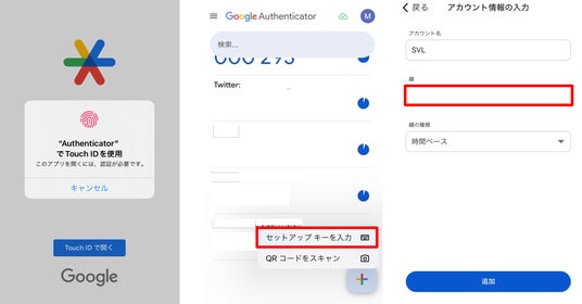 4 二段階認証のAppに移動。「セットアップキーを入力」からアカウント名を設定し、先ほどコピーした値を入力。