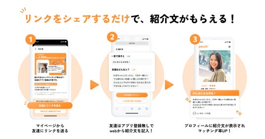 信頼でつながるマッチングアプリpecoliを運営している株式会社pecoli(本社:渋谷区、代表取締役 山田 浩太)は、マッチングアプリ上でも友達の恋を応援できる業界初となる友達に紹介文が書ける「かんたん紹介文」機能の提供を開始しました。送られた紹介文はプロフィールに掲載され、マッチング率の向上やその後のメッセージ返信率に繋がります。(※1)この新機能では、アプリ未登録の方でも登録済みの友達に紹介文を送ることが可能です。