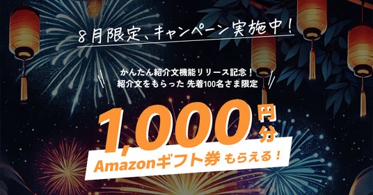 「かんたん紹介文」機能のリリースを記念して、8月15日(木)~8月31日(土)の期間で先着100名の紹介文を送ってもらった方に、Amazonギフト券1,000円分をプレゼントします。ぜひこの夏に、友達からの紹介文を通じて、新しい出会いのきっかけを作ってください。