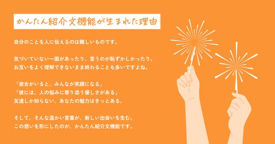 「かんたん紹介文」機能は、マッチングアプリ業界で初めて、ユーザーへ紹介文を書ける機能です。この機能により、アプリの登録者はもちろん、アプリに登録していない友達から登録している友達に対しても紹介文を送ることができます。ユーザーは友達からの紹介文を通じて、自分では気づきにくい魅力や個性を相手に伝えられます。また、相手の人柄や魅力が自然に伝わり、信頼感のある出会いを実現します。友達からの紹介文が後押しとなり、より安心して新しい出会いを楽しむことができます。