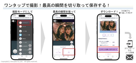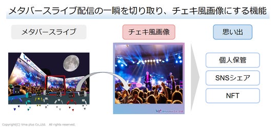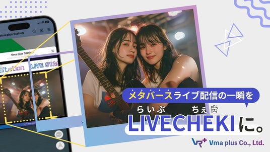 メタバースWeb3のコンテンツ企画・ディレクションを行うVma plus(ブイマプラス)株式会社(本社:東京都品川区、代表:津田徹)は、自社の提供するメタバースプラットフォーム「Vma plus Staion」に、メタバース内で投影されているライブ配信や動画などの映像をフレーム付きのスクリーンショットとして保存できる新機能「LIVECHEKI(らいぶちぇき)機能」を新たに導入いたしました。