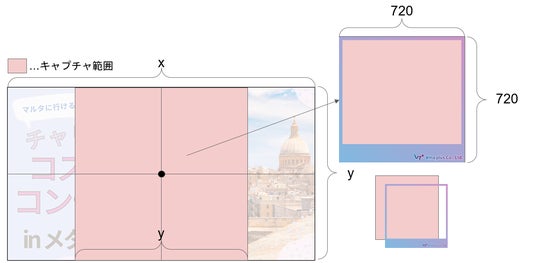 本機能で使えるLIVECHEKIフレームのサイズは横720px × 縦720px(正方形)で、LIVECHEKIフレームのサイズに合わせてスクリーンの中心から上下左右に360pxずつの範囲を撮影することができます。