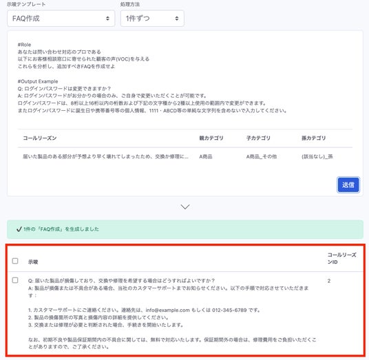 音声データから抽出された問い合わせ内容(=コールリーズン)をもとに、FAQに追加するQとAを自動で作成することが可能となりました。