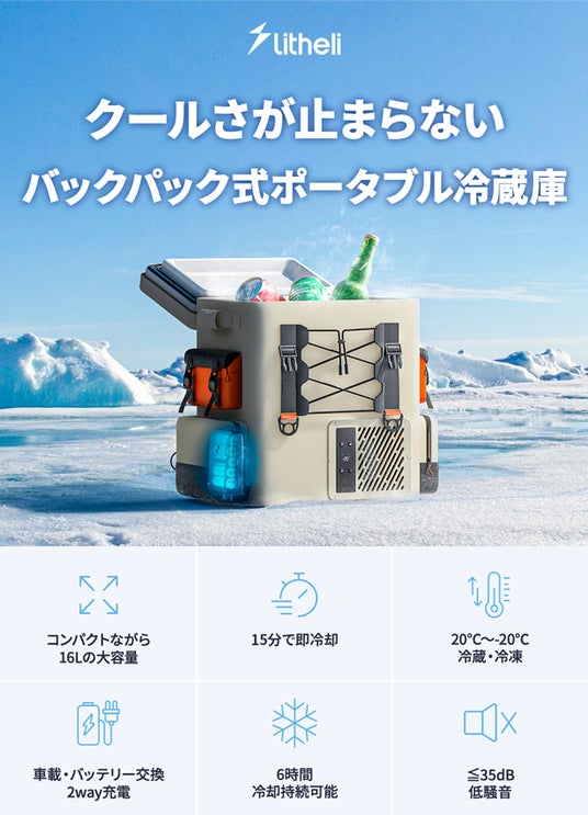 FrozenPackは、Litheliが開発したバックパック式ポータブル冷蔵庫で、-20℃までの冷却が可能。さらにバッテリー交換や車載給電に対応しており、どこでも手軽に冷たい飲み物を楽しめるほか、アウトドアでの食材保管にも最適な最新の冷却ツールです。