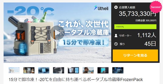 18年間電動・園芸工具の開発・生産に特化した電動工具メーカーLitheli「ライテリ 本社:中国、代表取締役CEO:(李斌 リビン)」から「15分で即冷凍!-20℃を自由に持ち運べるポータブル冷蔵庫FrozenPack」の応援購入プロジェクトを開始。8月14日(水)時点で応援総額3,500万円を突破し、Makuake冷蔵庫カテゴリーにおいて歴代最高の金額を更新中。
