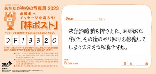 「想いをつなぐ」がテーマの本写真展では、来場者が、共感した作品に対する感想や想いを記した「絆メッセージ」を出展者に向けて投函できる「絆ポスト」を東京・名古屋・大阪会場とオンライン展示サイトに設置。来場者から寄せられる「絆メッセージ」を開催終了後に出展者に郵送で届けます。出展者と来場者の間で交わされる、写真を通じたコミュニケーションで新たな“絆”を生み出していきます。