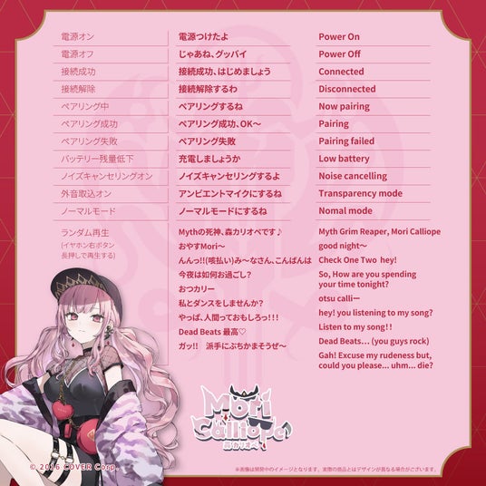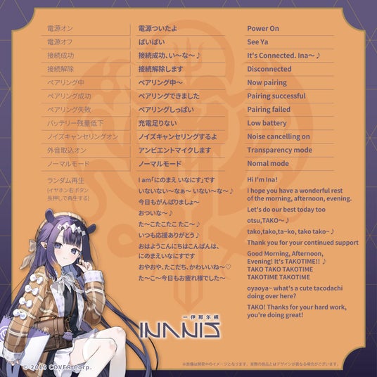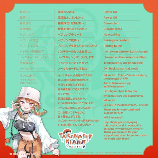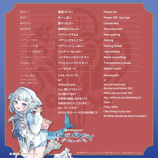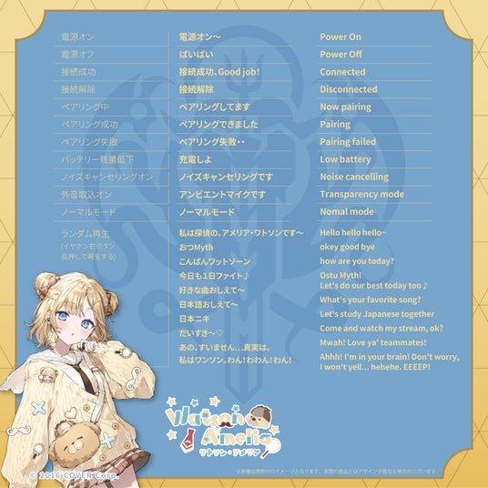 イヤホンの起動/終了や端末との接続状況をお知らせする「ボイスガイダンス」に加え、配信でもおなじみのフレーズをいつでも楽しめる「ランダムボイス」を完全新録で計200種類以上収録!