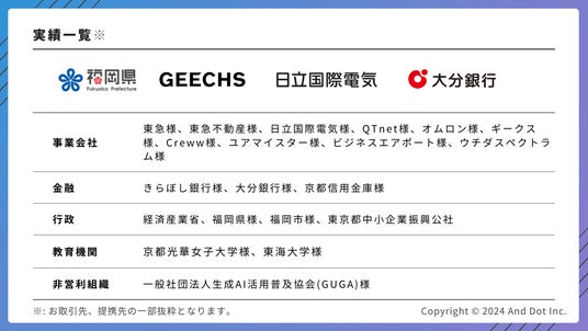 今回の業務提携の目的としましては、生成AI需要が高まる昨今で当社お取引先様への迅速かつ高品質なAIソリューションの提供を行うことです。アンドドット株式会社は事業会社、自治体や金融機関などと幅広い取引実績を持っており、業務連携を結ぶことによりその強固なノウハウを提供する。