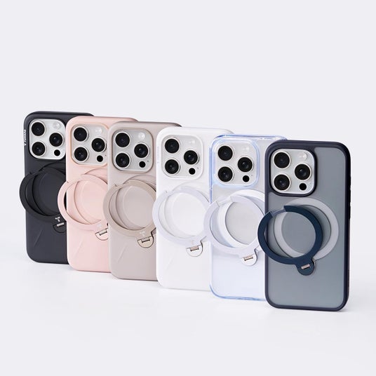 「Ostand Spin Fusion」シリーズは「Ostand Spin」シリーズに所属しており、「Ostand Spin」の多彩シリーズとも言えます。Spinシリーズと同様に、回転軸を回し90度ごとにカチッと止まり立て、MagSafe対応、耐衝撃性などの特徴を備えています。その一方、Fusionシリーズは、Spinシリーズの半透明なデザインからカラフルなデザインに進化し、それにバックパネルに施された3本のラインが、カジュアルスタイルとビジネス感を完璧に調和させます。