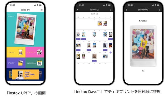 今回のバージョンアップでは、撮影したチェキプリント(TM)にイベント名をつけて、オリジナルのカレンダーを作成できる新機能「instax Days(TM)」を新たに搭載。スキャンしたチェキプリント(TM)や、「Link 3」アプリから転送したチェキプリント(TM)を、日付順に整理し、思い出を振り返ることができます。また、作成したカレンダーを「instax UP!(TM)」から直接SNSに投稿し、より多くの友人と共有するなど、チェキプリント(TM)の楽しみ方を広げます。
