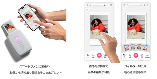 専用アプリを使用して、スマートフォンの画像を直感的な操作で簡単に編集し、そのままプリントできます。拡大縮小・回転・フィルター・明るさなどを編集でき、好みの仕上がりを選択可能。また、スマートフォンに保存した動画を取り込み、切り出した画像をプリントできます。