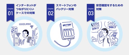 本マニュアルは、防災やインターネット分野の専門家による監修のもと、被災場所やインターネット接続状況に関係なく “人と情報とつながる備蓄”術をまとめたものです。パソコンやスマホからの閲覧だけでなく、PDF形式でダウンロードも可能です。印刷して手元に置いておくことで、インターネットがつながらない環境でも参照できるようにしています。