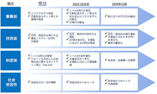 各事業の社会実装に向けて解決すべき課題や想定される解決策、期待される効果を網羅的に把握するため、コスト分析や事業継続性などの「事業面」、機体やシステムの実用性などの「技術面」、法制度や運用ルールなどの「制度面」並びに他地域への展開可能性などの「社会受容性」の4つの観点から、各実証事業の成果・課題を下の図のように整理しました。