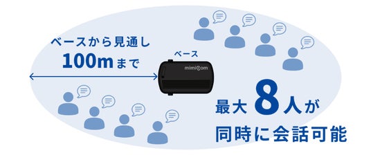 無線基地局となる“ベース”をエリア中心に、そのエリア内で“イヤーセット”を装着するだけで最大8人まで同時に会話可能です。IWATSUならではの通信ノウハウにより、クリアで遅延のない快適なコミュニケーションを実現します。