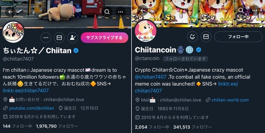 ※ Xのフォロワーは2024年8月19日現在197万人以上、Chiitan☆Coinのフォロワーは34万人以上