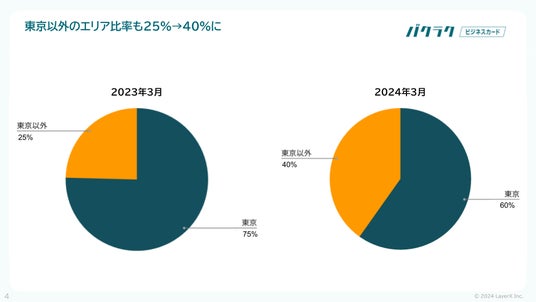 バクラクビジネスカードをリリースした初年度は東京のIT系スタートアップ企業を中心にご利用いただいていましたが、今では約4割が東京以外のお客様となっています。