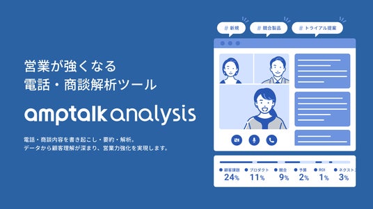 「amptalk analysis」は、IP電話やテレビ会議システムなどあらゆるコミュニケーションツールと連携し、オンライン・オフライン関係なく商談や通話を自動で書き起こし・要約・解析し、Salesforce / HubSpot / Slack / Microsoft Teamsチャットに自動出力することで、オンライン商談を自動化・可視化します。「amptalk analysis」を用いることで、あらゆる企業のセールスイネーブルメントを実現し、インサイドセールスからフィールドセールス、カスタマーサクセスまで営業組織全体の生産性向上を支援します。