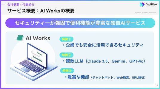 株式会社デジライズは「AIの利便性と感動を全ての人に届ける」をビジョンとして2023年に事業を開始しました。「法人リスキリング(R)︎」というAI研修(動画学習+ワークショップ)と自社開発の企業向けChatGPT「AI Works」を提供するサービスを、上場企業を筆頭に多くの企業様に導入を進めております。