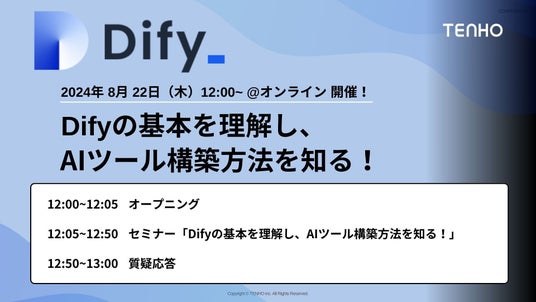 生成AIに関する研修事業を展開する株式会社TENHO(本社:東京都渋谷区、代表取締役:田村 允)は、デジタルシティ株式会社(本社:東京都渋谷区、代表取締役:大島 予章)と共催で、生成AIツールを簡単に作成できる開発プラットフォーム「Dify」を1から学べる無料オンラインセミナーを、8月22日(木)12:00~13:00にて開催します。