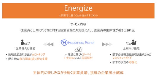 そこで、ハピネスプラネットは人間科学とAI技術を用いて、従業員が新しいことに挑戦する動機づけやその継続を支援するマネジメントツール「Energize」を開発しました。Energizeは、日々の業務に挑戦を加え、仕事を楽しみながら没頭する従業員を増やすことを狙っており、主体的な企業風土づくりを支援します。