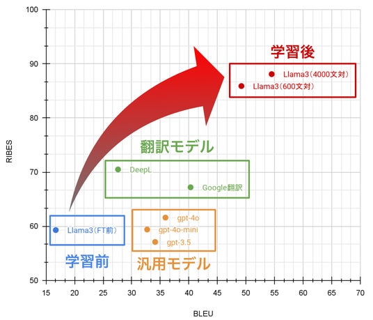 特定分野の特許翻訳600文対並びに4000文対を用いてファインチューニングを実施した結果、『Llama-3-70B』の特許翻訳性能を大幅に向上させることに成功しました。その結果、BLEU・RIBES両評価指標において、DeepLやGoogle翻訳といった翻訳モデル及びGPT-4oを始めとする汎用的なLLMを凌駕する特許翻訳性能を達成しました。