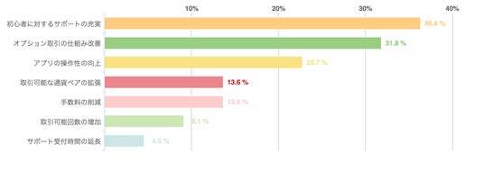 アンケートによれば、「オプション取引初心者に対するサポートを充実させてほしい」という意見が36.4%で最も多かった。中には、「初心者向けのチュートリアルを充実させてほしい」「公式サイトからオプション取引に関する情報提供を積極的に行ってほしい」といった具体的な意見も多く見られた。