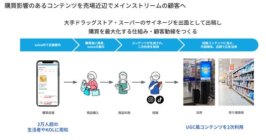 この「osina」に投稿されたコンテンツを店頭デジタルサイネージでも活用することで、SNS上でバズを発生させるだけでなく、SNSを活用していない生活者にもPOSに寄与しているコンテンツをアプローチができる本共同パッケージを活用することで、顧客へ直接的に商品への興味関心、購入意向、購入の最大化を図ります。