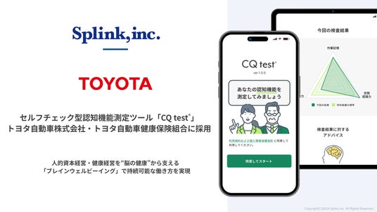 ブレインヘルスケア領域の医療AIスタートアップ、株式会社Splink(本社:東京都港区、代表取締役:青山 裕紀、以下「Splink」)は、当社が開発・提供するセルフチェック型認知機能測定ツール「CQ test(R)」( https://www.brain-life-imaging.com/cqtest.html )がトヨタ自動車株式会社(以下「トヨタ自動車」)とトヨタ自動車健康保険組合(以下「トヨタ健保」)にて採用されることをお知らせいたします。
