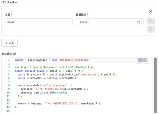 JavaScriptアクションから別のアクション(ベースマキナ上でのSQLの実行やAPIコール)を呼び出す機能や、コード入力のサポートを行う機能がついています。