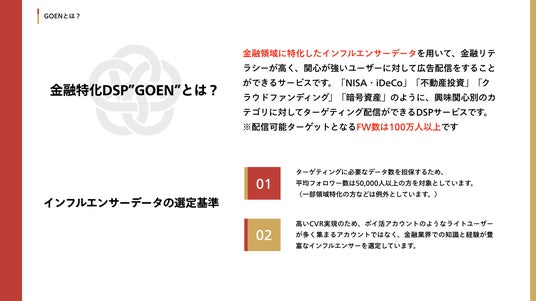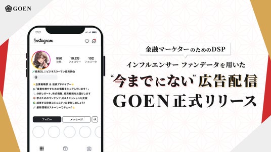 「GOEN」は、特に金融系マーケターに向けたサービスとして設計されており、3rd party cookie規制が進む中、ターゲティングの重要性が一層高まることを背景に開発されました。本サービスでは、金融分野に精通した200名を超えるインフルエンサーのオーディエンスデータを中心としつつ、より効果的な広告配信を実現します。