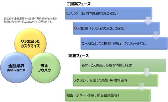 本サービスでは、金融業界での実績やノウハウ、専門知識、技術をもとに、お客様にあわせて内容をカスタマイズしてご提案いたします。以下は、ご提案~実施フェーズの概略を示したものです。