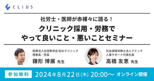 クリニックにおける採用・労務は運営をスムーズに成功に導くための重要な論点です。それにも関わらず、勘所を抑えるのが難しかったり、情報がなかなかありません。そこで今回は実際にクリニック運営の成功・失敗を経験している医師と、数多くのクリニック医師から相談を受けている社労士の専門家が登壇し、赤裸々にクリニック採用・労務のやって良いこと・悪いことをお伝えします。オンライン開催で参加費無料です。クリニックの運営に必要な内容になっていますので、奮ってご参加ください。