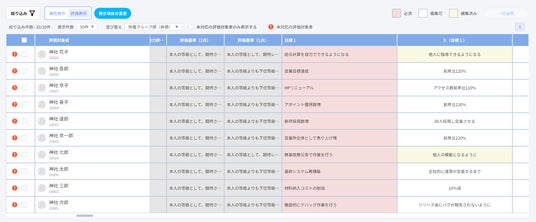 これにより、評価対象者が数十人以上存在する場合でも、対象者の評価シートを一覧画面上で確認/編集できることから、評価者が評価シートを入力する手間を削減することにつながります。