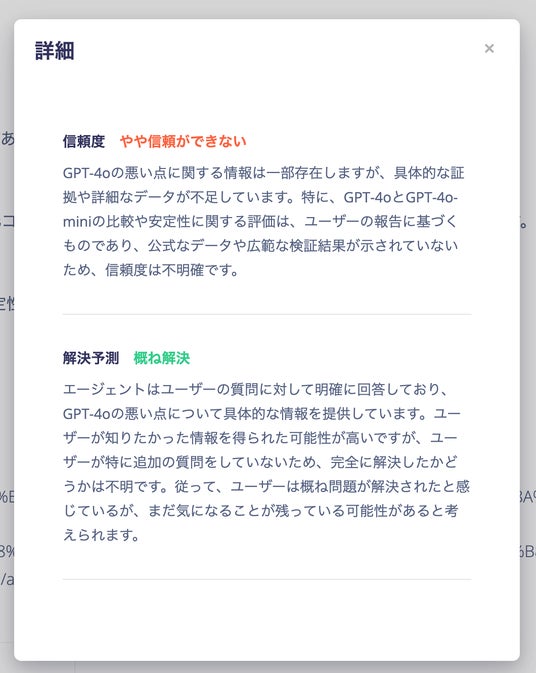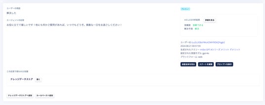 AIに話しかけたユーザーの抱える課題を本当に解決する回答ができているかを判定します。ユーザー満足度の高いAIになっているかを確認できます。