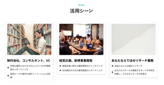 Deskrex Appは、幅広い業界・職種でご活用いただけます。制作会社や、コンサルティングファーム、ベンチャーキャピタルなどでは、多様な業界における調査の必要が生まれた際に、短時間で高品質のレポートを作成することが可能になります。これまでは人手で対応せざるを得なかった案件も、Deskrex Appを使えば、わずかな工数で調査できるようになります。
