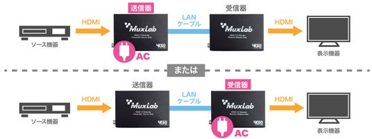 PoC(片側給電)に対応しており、ACアダプターを送信器または受信器のいずれかに接続すれば、もう一方へはLANケーブルを通じて電源供給できます。