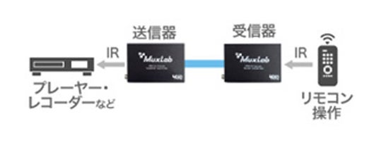 IR延長HDMI信号と同時にIR信号(片方向)も延長できます。受信器を設置した場所から、バックヤードに設置したソース機器のリモコン操作が可能です。