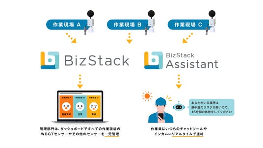 BizStackと合わせて導入することで、WBGT計の値をクラウドベースで活用できます。建設現場監督や作業員はBizStack Assistantに問いかけるだけで現在の熱中症リスクを把握したり、手持ちのスマートフォンでセンサーから離れた場所でも通知を受信したりできるようになり、現場の安全性向上に寄与します。