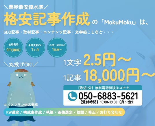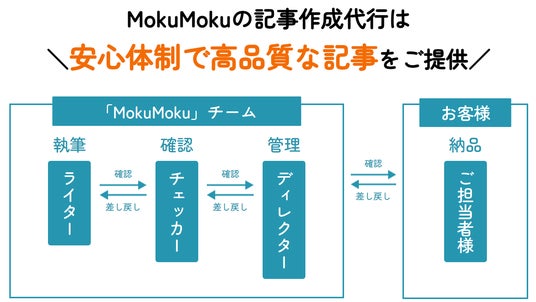 記事作成サービス「MokuMoku」は、チーム体制で品質と納期を第一優先に記事作成を代行します。