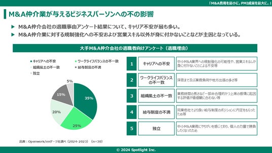 - 弊社の調査結果(下記 図2-3を参照)、中小M&A業界の規制強化の可能性および専門的スキルが身に付かない恐れを事由とする退職割合が35%を占めています。
