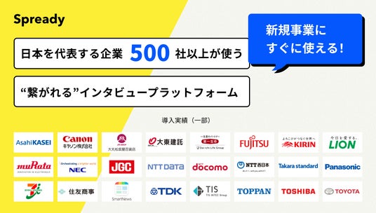 一方、「Spready」は、「日本のイノベーションに必要な出会いを、すべてSpreadyから」をパーパスに掲げ、国内大手企業の約500社が利用するユーザーインタビュープラットフォームを運営しています。
