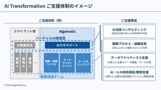生成AI技術を活用したサービスの開発・提供を手掛ける株式会社Algomatic(本社:東京都港区、代表取締役社長:大野峻典、以下Algomatic)は、日本企業の業務変革を推進する「Algomatic AI Transformation(AX)*1」のサービス提供を2024年8月より開始いたしました。