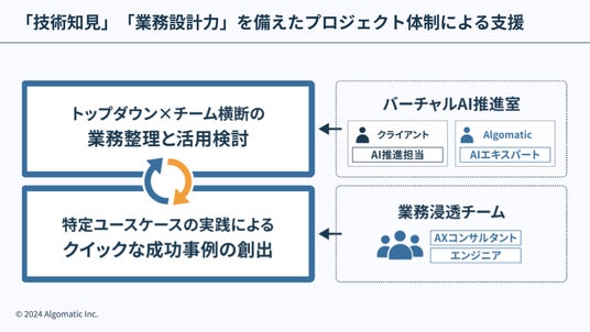 「Algomatic AI Transformation(AX)」は、職能横断的な経験を持つ専門人材がトップダウンの戦略的AI導入と、現場のニーズに即したユースケース開発を両輪に、AI活用による業務変革を支援します。