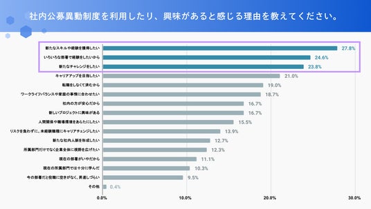 また、「社内公募異動制度がないが、もしあれば利用したい」と答えた回答者でも、「新たなスキルや経験の獲得」との理由が38.6%とトップにあり、社内公募異動制度を利用したい・興味がある人は、所属企業内での、新たな挑戦やスキル獲得に興味があることが伺えます。