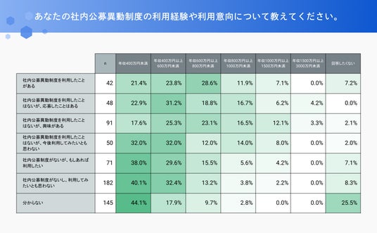 年収別でみると、社内公募異動制度を利用したことがある人が最も多いのは、年収600~800万円の層で28.6%、応募経験がある人では、年収400~600万円の層が多く、31.2%となりました。