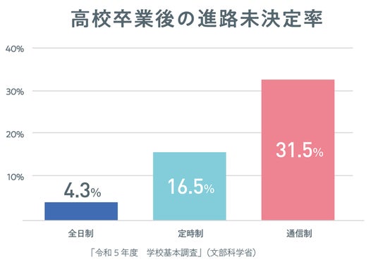高校生の新卒採用を検討している企業は「明るさやコミュニケーション力」を重視する傾向が強く、「通信制高校の生徒」というだけで、企業側から敬遠されることは珍しくありません。加えて、通信制高校の生徒は「学校に通う」という機会が少なく、居住地も各地に点在しています。結果的に、学校や友達との関係性が強くならないまま卒業を迎えてしまうケースも多く、そのような状況下における「進路未決定のまま卒業」は、さらに社会的孤立を深めてしまう要因にもなっています。