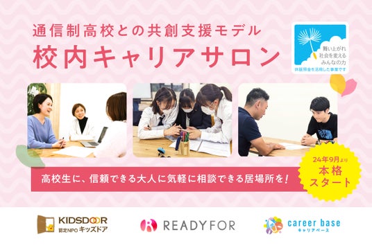 NPO法人キャリアbase(所在地:千葉県柏市、代表:草場 勇介)は、2024年6月、休眠預金等交付金を活用した『高校生世代の子育て家庭「くらしと学びの危機」緊急支援事業』(資金分配団体:キッズドア様、READYFOR様)に採択されました。本事業の実行団体として、2024年9月より、通信制高校内における『校内キャリアサロン』のプロジェクトを本格的にスタートいたします。