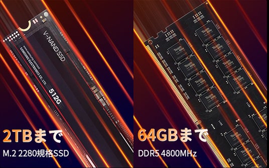 デュアルチャネルのDDR5、2つのSSD拡張スロットを備えており、メモリは64GBまで、M.2 2280規格のPCle SSDは2TBまで拡張することができます。大容量ストレージとデータの高速転送においても、速度と容量確保が両立できます。